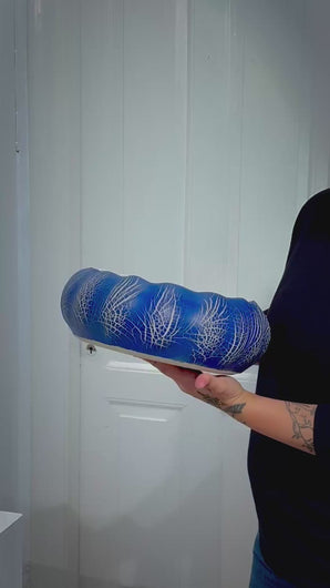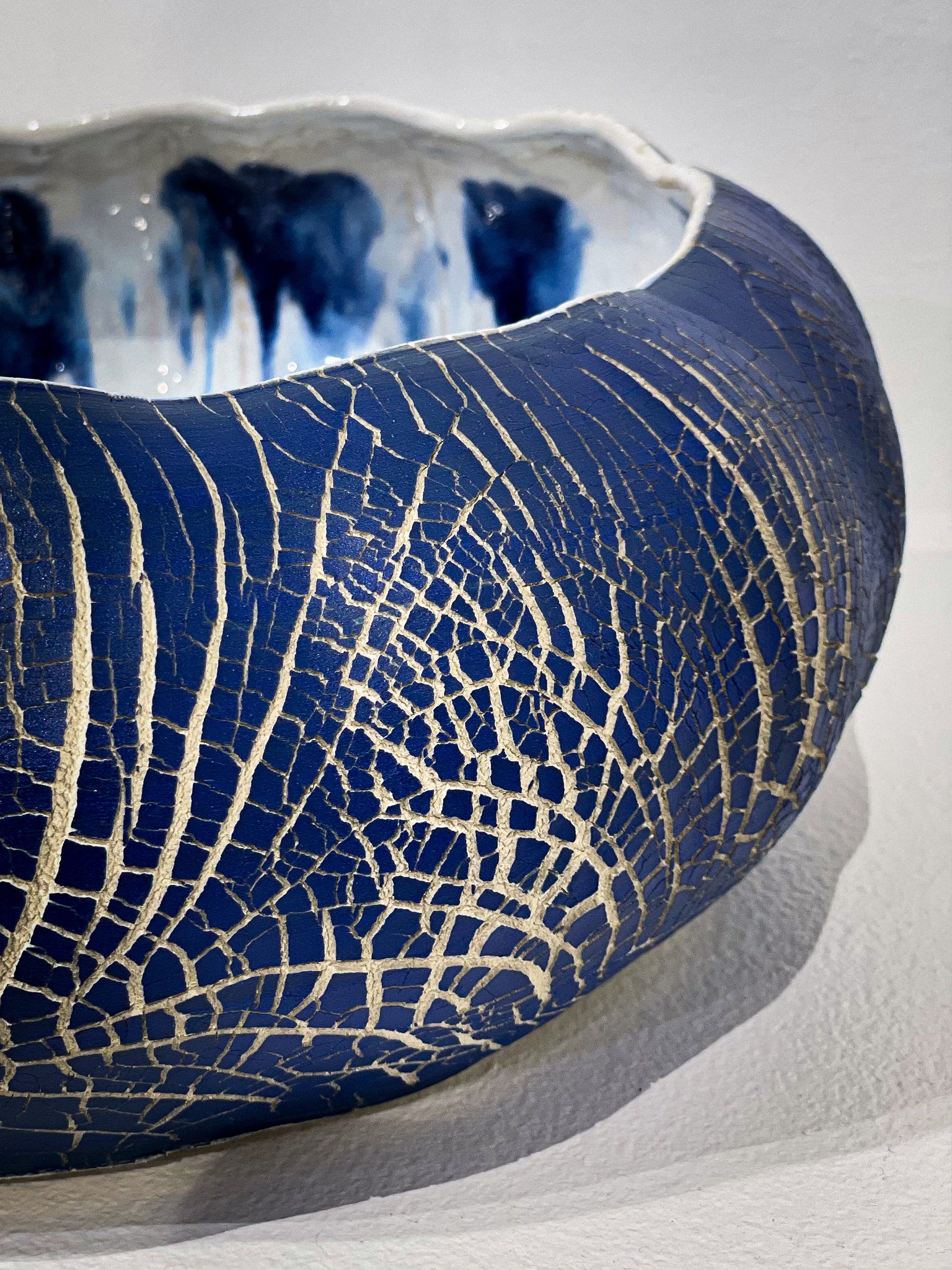 En skål utan stengods som först blivit drejad och sedan stretchad för ett spännande uttryck. Skålen är matt blå på utsidan och blank vit och blå på insidan.